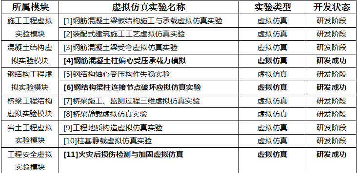 遵循教育部土木工程类专业学生实验教学的基本要求,中心面向土木工程、工程管理、道路桥梁与渡河工程专业,发挥“教研结合”优势,建设有施工工程、混凝土结构、钢结构、桥梁工程、岩土工程等 5 个虚拟仿真实验模块,共 10 个虚拟仿真实验项目(见表1)。目前已研发成功两个项目:钢筋混凝土柱偏心受压承载力模拟、钢结构梁柱连接节点破坏虚拟仿真实验。其他项目正在研发阶段。